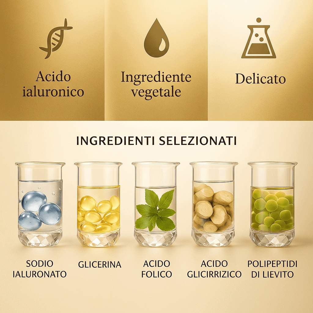 Acqua, glicerolo (glicerina), glicole propilenico, glicirhizinato dipotassico, allantoina, ialuronato di sodio, vitamina H, vitamine B1/B2/B3/B6, lievito.